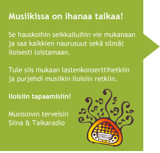 Hei! Olen Siina, muusikko, musiikkipedagogi (AMK) ja musiikkileikkikoulunopettaja. Olen toiminut varhaisiän musiikinopettajana sekä suunnitellut ja toteuttanut lastenkonsertteja ja -tapahtumia sekä musiikkiäänitteitä. Toimin myös aikuiskouluttajana ja musiikkikasvattajana sekä juontajana erilaisissa lapsiyleisölle suunnatuissa tilaisuuksissa. Lisäksi teen tv-toimittajan ja -juontajan töitä sekä kirjoitan. Vuonna 2010 minut palkittiin Vuoden Kasvattaja 2010 -palkinnolla.